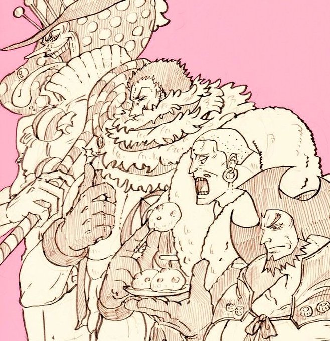 過去絵ばっかですけど、こんな感じにテゾーロ一味やシャーロット家は大人数でしかも巨漢が加わってるから、全員描く場合どうしてもギューギュー詰めになりますよね。「はーい!もっと寄ってー!そこ見切れちゃうからーもっとくっついてくださーい!」って念じながら描いちゃうよね