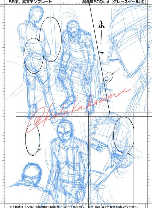 1枚目2コマ目左側に立ってる人物、最後のコマの座ってる人物の頭など、2か所のアタリ線は反転した状態で描いた。んで表面(現状の形)にもどして他のアタリ線を入れて、これをベースに下絵(2枚目)を入れてる。3枚目線画(アナログ)4枚目完成(デジタルトーン)