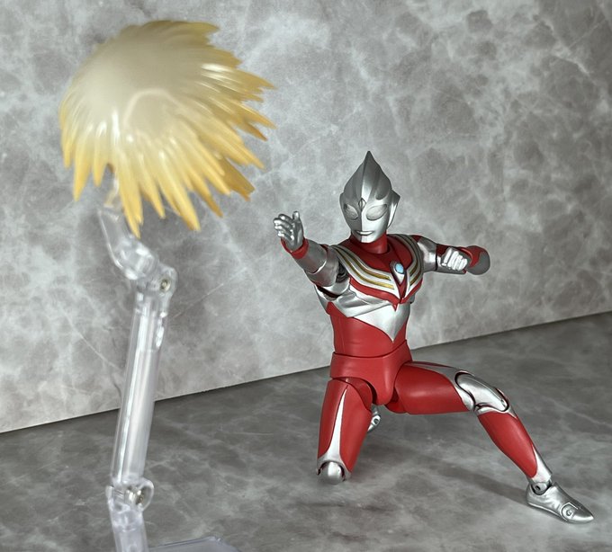真骨彫ティガパワータイプ 軟質素材は引き続き使われてるけどマルチの時のような凹んで跡がつく、一度でも干渉すると擦れて塗装が剥がれると言った事故は起きずかなり遊びやすさが上がってますね。 デラシウム光流も付属のアタッチメントでスタンドに刺せばかなり自由にディスプレイできます!😆