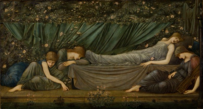 バーン=ジョーンズの描いた一連の眠れる森の美女(いばら姫)。えっとえっと、あのえっと、アノエットエト、一番トラボルタっぽいのはどれかしら? #WatchingGirl
