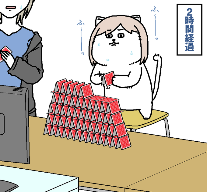 タキオンがトランプタワーを10段積もうとすると必ず失敗するってイベントがあって「2009年を超えられないののかなぁ」と思った。 積ませるしかねぇ……。 #アグネスタキオン