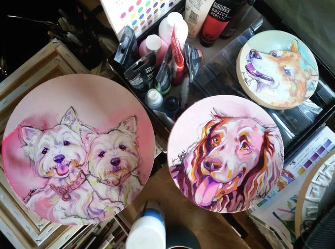 今日は兵庫県芦屋市の #ドッグカフェ 彦さんへ🚗#ケリーブルーテリア の彦ちゃんもご来店😄✨以前オーダーで描いた作品は親指アップの予定だったけど依頼主様と相談の上、肉球が描けるのでやぁ✋❗と手を上げてるポーズに。うん。今見てもこのポーズで良かった😄🎵