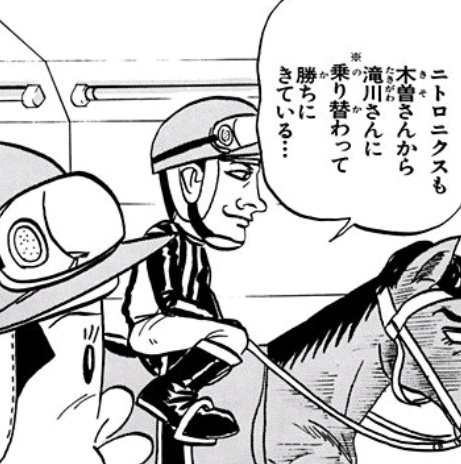 初登場の滝川、これしか情報ないもんな……NHKマイルでリーディングジョッキーという情報が出てくるけども、そのときも横顔写真だし……本格的に顔出しするドバイ編はアニメ終盤との放送と被ってるので、むしろアニメはよくキャラデザしたよなという感じ