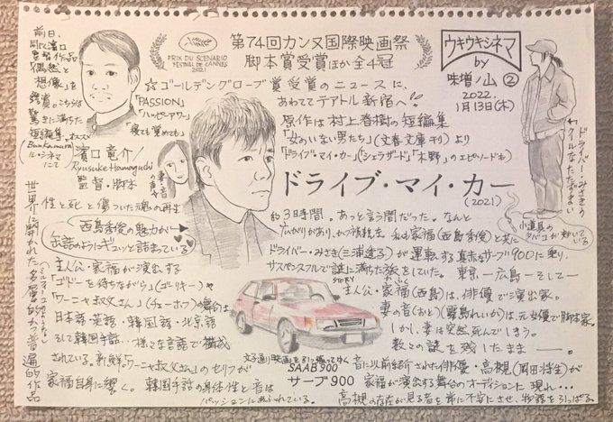 今日は龍神様に会いに田無神社に行くつもりだったけど、豪雨だったので変更して家でパウンドケーキ焼いてドライブマイカーみて絵描いて150分のスペシャルエステに行きました。いい日〜 #ドライブ・マイ・カー #イラスト