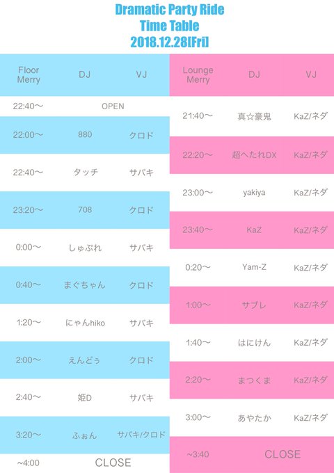 #ドラパライド のタイムテーブルを公開します!! 2フロア制でアニソンと映像を楽しめますので、ぜひ遊びに来てください!! https://t.co/zAKqTCaVr1