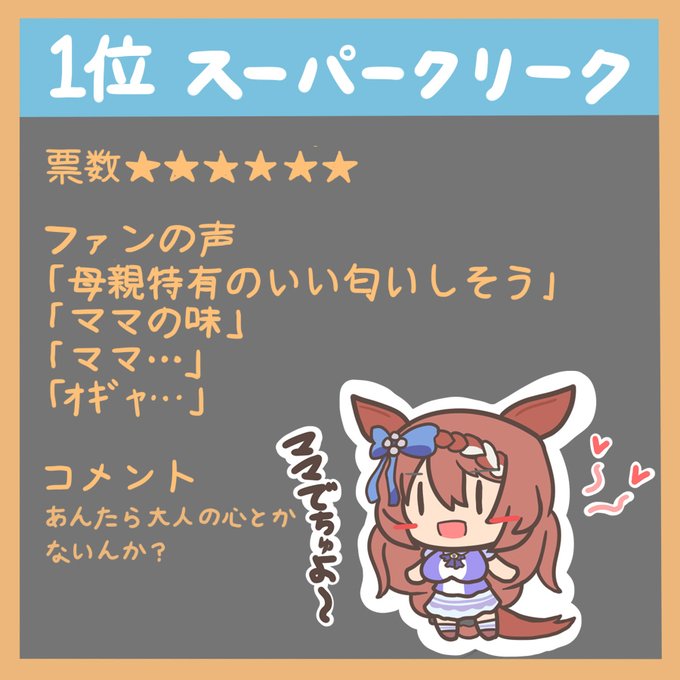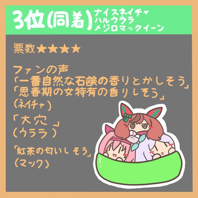 これはニコニコで「いい匂いしそうなウマ娘を教えて」と軽いアンケートを取ろうとしたら思いの外コメントがいっぱい来て「いい匂いしそうなウマ娘ニコニコ杯」が発生した時に集計し、その結果発表 その時のコメントの様子 https://t.co/hCish72X36