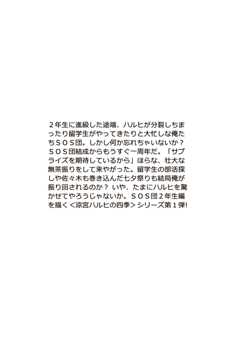 サークル:サルクス・プロドロモスの新刊「涼宮ハルヒの春宵」に書いた3作の冒頭試し読みをpixivにアップしました!