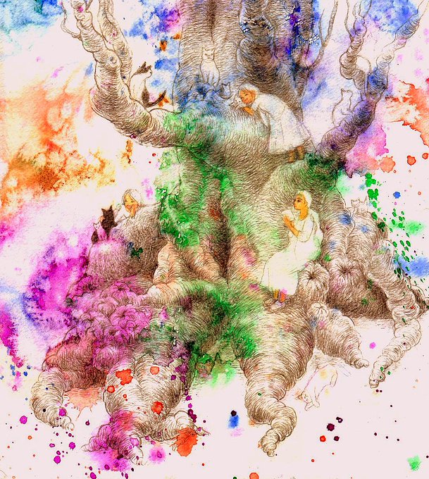 木と猫と女の子たち 水彩絵の具とシャーペン