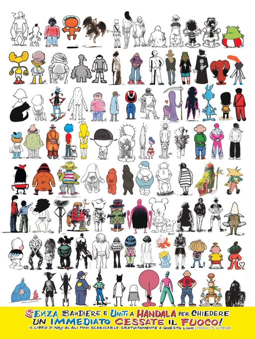 イタリアの漫画家80人が起こした停戦キャンペーンです。象徴となっている”ハンダラ”というキャラクターを描いたパレスチナ人の作家Naji al-Ali(ナージー・アル・アリー)氏は既にこの世にありませんが、彼の描いたキャラクターは生き続けています。