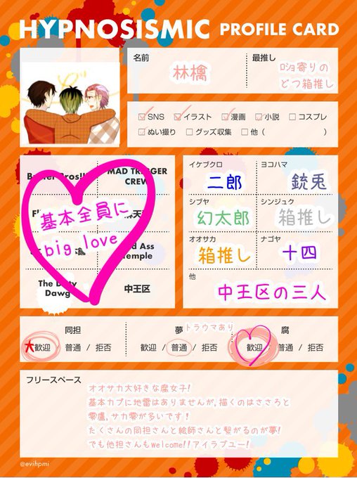 #ヒプマイ自己紹介カード #ヒプマイ好きさんと繋がりたい #ヒプマイ絵描きさんと繋がりたい #ヒプマイ腐女子さんと繋がりたい