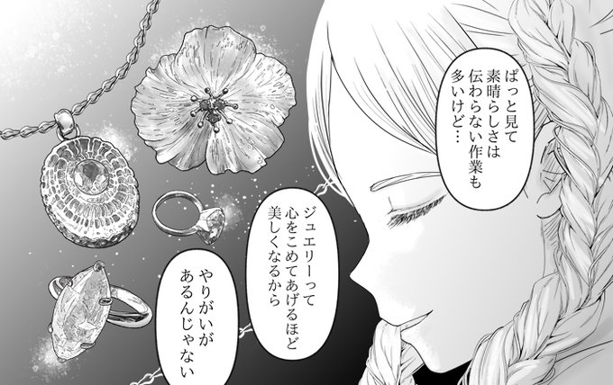 4巻の『宝石商のメイドと双子の卵』に登場する数々のジュエリーは貴石彫刻オオヨリ様が実際に製作され、ロウ付けのシーンの花のブローチはTO LABO(@tolabo_jewelry)様のシーブルーカルセドニーフラワーピンブローチを使用させて頂きました。一つの原石から匠の技で削り出されたそうで圧巻です…! https://t.co/gNYGAFb3Fs