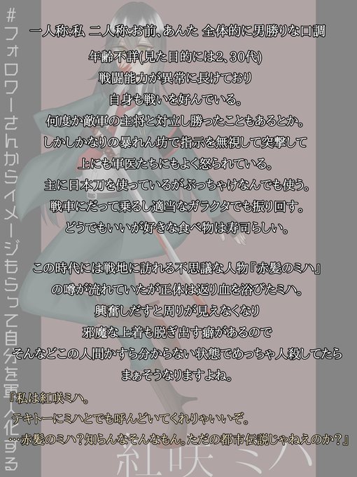 @sousakuTL #フォロワーさんからイメージもらって自分を軍人化する 要素ありがとうございました!よかったら遊んでくだちあ!!