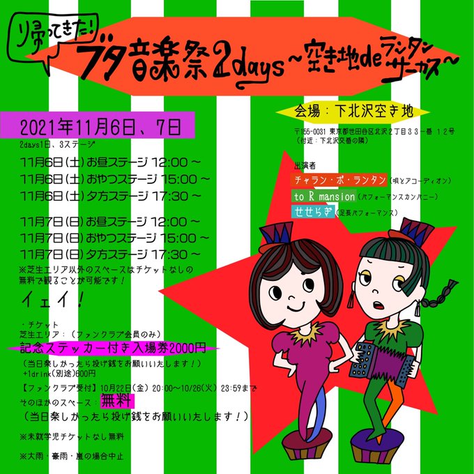 【ブタ音楽祭マップ🌟】 11/6(土)・7(日) 『帰ってきた!ブタ音楽祭2days 〜空き地deランタンサーカス〜』 🔸下北沢駅〜会場までのマップ 🔸ブタ音楽祭会場マップ 作りました! 有料芝生エリアのチケットは現地にて当日券を販売いたします! 皆様是非観に来てください🤝 https://t.co/UbHidWTnkh