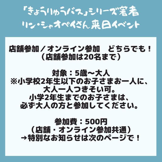 「きょうりゅうバス」シリーズ著者のリン・シャオペイさんの来日を記念して、11/5(土)にブックハウスカフェさんで、リンさんをお招きし楽しいイベントを開催します👩🏻🎨✨サイン会&絵本購入で素敵なプレゼントも!お申込み受付中です☺️→https://t.co/Zu7qgCyRAA
