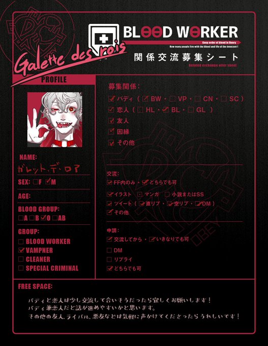 @BLOOD_WORKER 追記と募集:職種関係なく話しかけるので仕事着での知り合いや友達などお気軽に!仕事着を着てれば少しフランクな丁寧語で楽しそうに話します。※恋人など大事な関係はDMにて(HL限定)