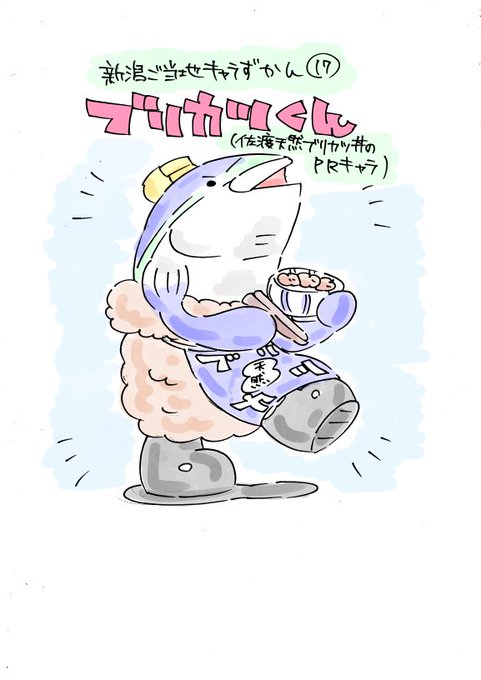 毎週金曜夜に #アトリエノアノア が更新していく #ノアノアアート 😎今回は、佐渡ご当地グルメ普及促進協議会 #ブリカツくん を描いてみたっちゃ🐟💨