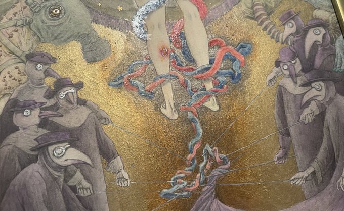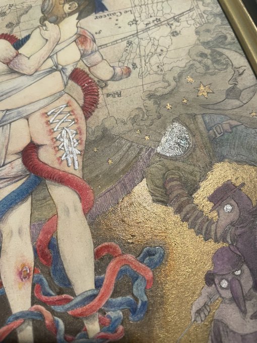 今回、ペスト医師のマスクを描くに当たってどんなマスクがあったのか調べてみたんだけれど、こんなに種類豊富だとは思わなかった。絵を描くと賢くなる。凄い。でも実はマスクとは関係のない星図部分の点描や傷の描写が楽しかった。 https://t.co/83PGocj70h