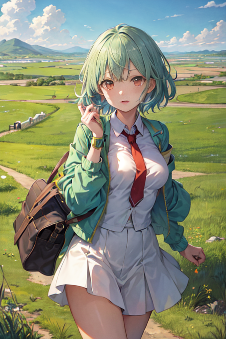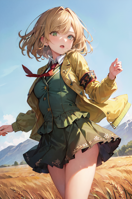 ただいま戻りました。食事中に「学生服ではなく私服なら?」と思いschool uniformをNPに、plain clothes,private styleをプロンプトに入れて私服にしてみました。まずこの変化がどう出るかで再びペプラムジャケット(peplum jacket)でジェネレート。3枚目が一番近そうです