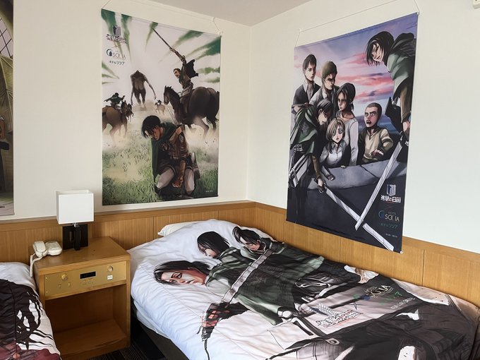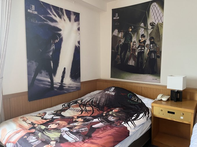 ホテルソシアさんのsngkコラボルーム、二泊する際はベッドカバー(選択可)とタペストリー(ランダム)を替えていただくことが可能でした