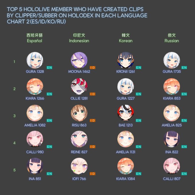 ◆ 過去一年で記録された切り抜きの量が1~10位以内のホロライブメンバー (2021-07~2022-07)