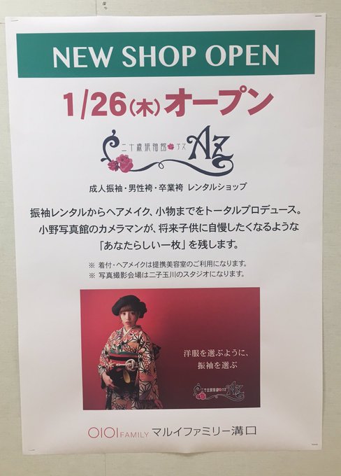 来週26(木)二十歳振袖館Azマルイファミリー溝口店がオープン!振袖セレクトショップという世界観を6年前に茨城で立上げ、Azがマルイに出れるのは嬉しく、ほんと皆が頑張ってたお陰。感謝です。オープニングキャンペーン実施中です!