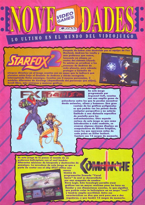 同誌発行時期はまだ発売予定にあり同時期のCESで最新画像の公開もされていたスーファミ・スターフォックス2、FX FIGHTERS、Comancheの紹介記事。FXチップ搭載の3作は発売中止
