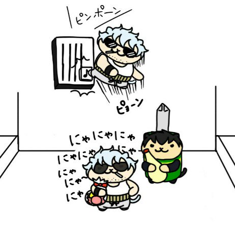 @asa504asa 「にゃにゃ~(ちわ~。1204号室のねこなんですけど~。あ、うちは派生が交代で泊まるから色んなねこが出入りすんだけどよ。うちの原作設定からオレと似たかっこの人間が居るっつーから挨拶に来たって訳だ。コレ、あめちゃんな。こっちの奴はオレのツガイで(続))」 #メゾン銀土 #1204_gh #ねこぎんひじ