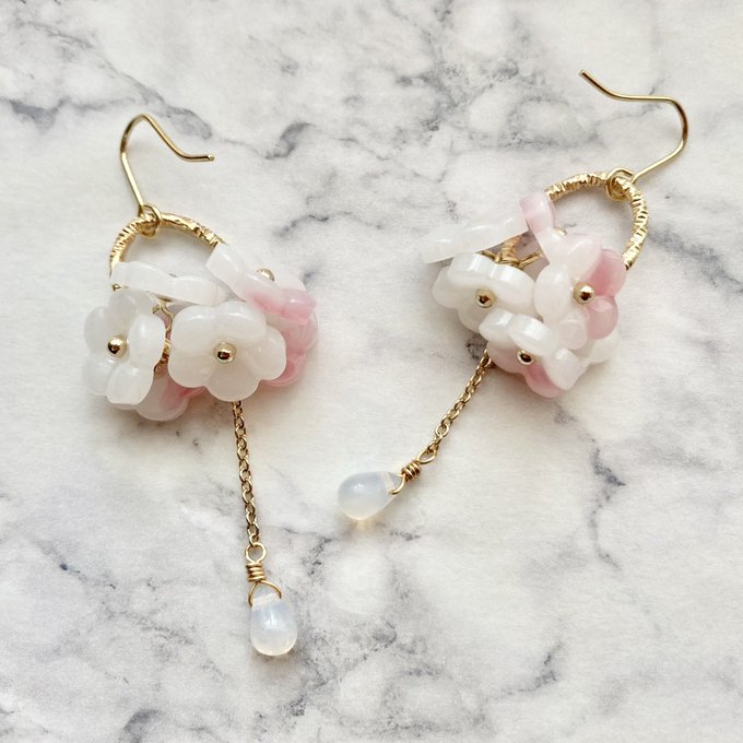 今回のレイドでも働いてくれたきざくらさんイメージで新作!白だけじゃなくてほんのり赤みを加えたお花に、乳白色の雫はきざくらさんが飲んでるお酒のイメージ🍶