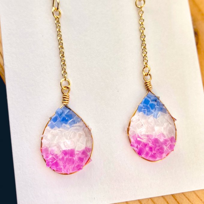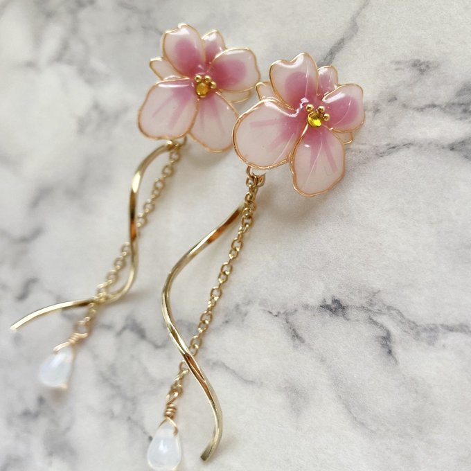 久しぶりにイメージアクセサリー作りました!キクミコマチちゃん(未所持)ワイヤーパーツにレジンをぷっくり盛って桜っぽく🌸しずくのパーツもレジンで🙆♀️