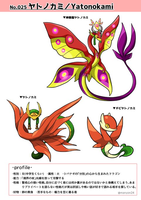 ヤトノカミちゃんは爬の国の住人であり竜種だ。飽き性で三日坊主。定職にはついておらずいわゆるニート。角の形状は好みで変えられる。異常に強い念力の持ち主で恨まれると祟られる。丁度悪口をほざいてる茶色い害虫がいたので暇つぶしにとびっきり邪悪な念を注ぎ込み祟る。濡女ちゃんと仲良し。