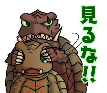 先日のイリスに引き続き、 ラインスタンプ風イラストを再掲…。 冷静に考えたらラインで「いただきます」使う機会ってあるだろうか…? #ガメラ