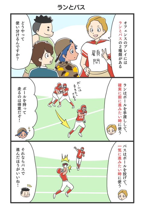 今回は【ランとパス】について。アメフトのプレイは大きく分けるとランとパスに分けられます。次はランかな?パスかな?と予想しながら観るのも楽しいです。