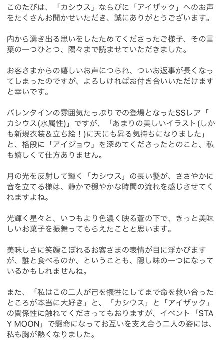 なおこれはステムンを1月末に遅れて読んでカシウスとアイザックに落ち、すぐラーメンイベントに突入して情緒乱され、更にバレカシウス実装に狂喜乱舞して運営に御礼申し上げたと同時にカシウスとアイザックについて熱く語った際に頂いたお返事です読んできくうしのフォロワー…あまりにも詩的……