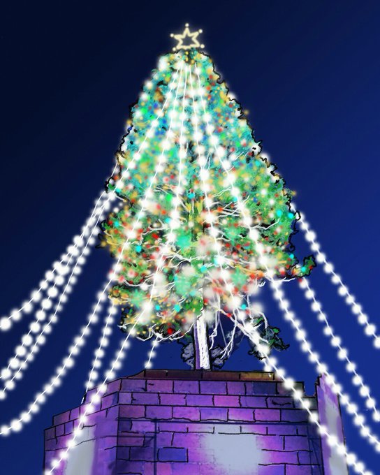 我らがヒノキアスナロちゃん。せめて「絵」でクリスマスツリーにしてあげようと思いまして、写真使うと「法的機関に相談」される恐れがあるので、つたない画を描いてみました。フォトショ使いじゃないのでこの程度でお許しください。オーナメントもついてます!! #世界一のクリスマスツリー