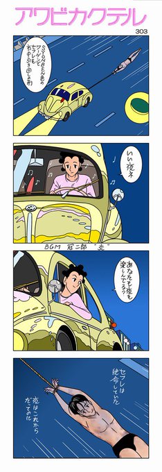 コマの外にそのとき聴いてるBGMを描くヤツ、わたせせいぞう先生の十八番ですね。そしてそれを遊び半分で換骨奪胎するのが俺たち中川ホメオパシー。そこんとこよろしく。