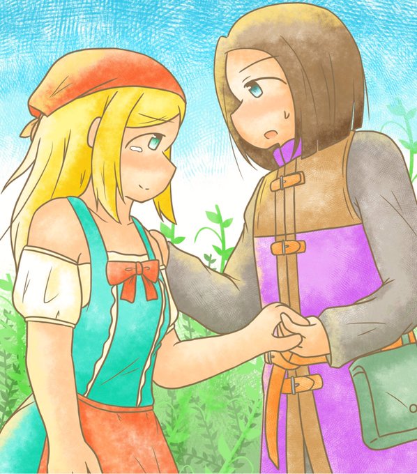 おはようございます、今日は主エマの日とお伺いしたので!素敵記念日、タグありがとうございます〜!やっぱこの二人を描く時はイシの村バージョンの服にしてしまうのはお約束、、、、 #主エマの日