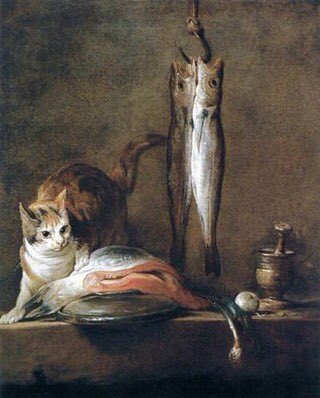 『猫とサケの切り身、鯖2匹と乳鉢』