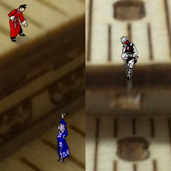 参考になるかと思ってセリアで買った木の模型、お寺と五重塔にトウロくんとヒカさんとナタくん描き込んでみた。#イラスト #創作漫画