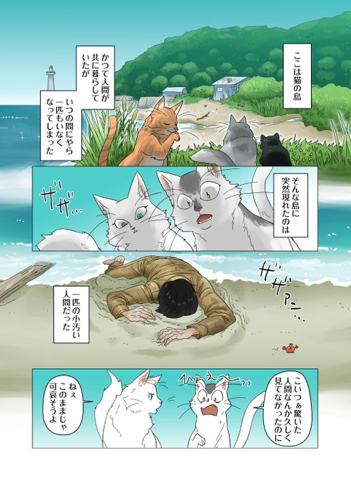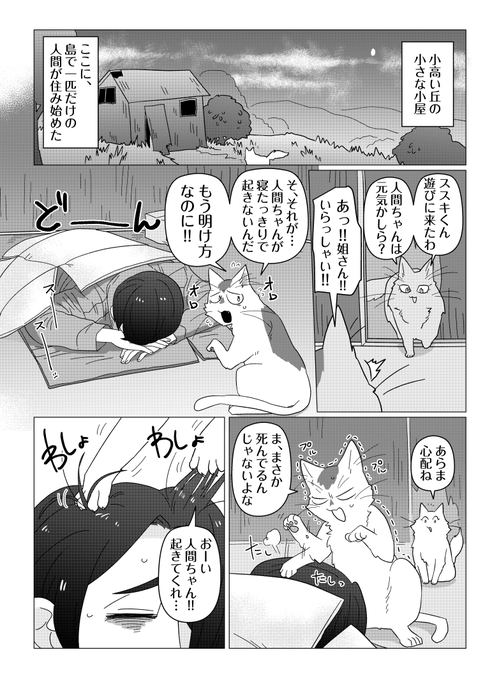 猫たちが暮らす無人島に一匹の人間が流れ着いてきた。世話好きの猫・ススキは言葉の通じないその人間を飼うことに!猫の目線で描かれる人間と猫との心温まる毎日。
