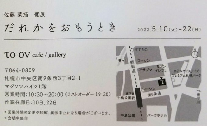 佐藤菜摘個展「だれかをおもうとき」 2022.5.10(火)-22(日)/TO OV cafe gallery(札幌南9西3)/10:30~20:00/在廊日10,22日 GW明けに展示をします。 気もそぞろな日々が続いていますが、一息つける時間になればうれしいです。ふらりと遊びにきてくださいな~ どうぞ、よろしくお願いいたします
