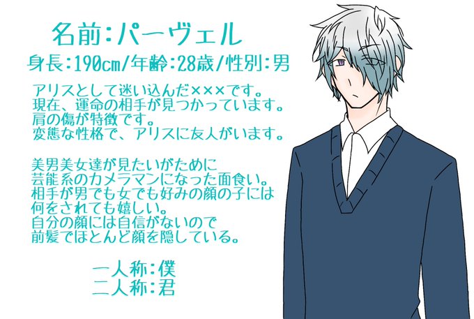 僕アリ【@My_fate_Alice】に一人目失礼致します。双子のハート持ちの青年です。運命の相手や友人関係等募集しています。どうぞよろしくお願いします。#僕アリキャラシート #僕アリ #僕アリ参加者様と繋がりたい