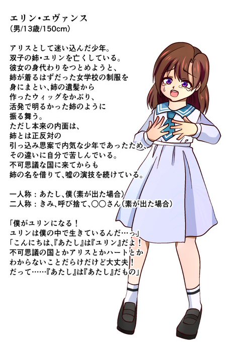 亡き双子の姉の代わりをつとめようと女装演技する男の娘アリスくんです。今のところ関係真っ白けなので、どうぞ仲良くしてください!