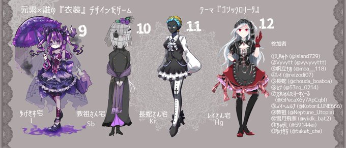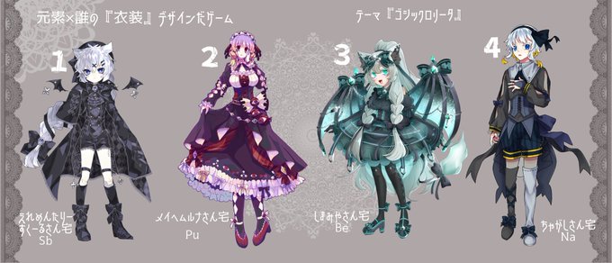 ゆげちゃん(@ takat_che)主催の #元素X誰の衣装デザインだゲーム に参加させて頂きました〜!テーマは「ゴシックロリータ」です🖤私がデザインした「衣装」を着ているのはどの子でしょうか!当ててみてください👐✨リプにアンケート繋げます↓↓↓