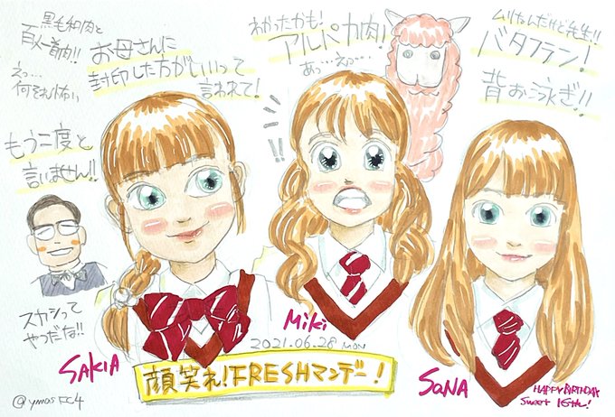 ヘアメイクバッチリなヤギミキちゃん可愛かった!木村さんの三編みも似合ってて素敵!白鳥さんはいつも描くのがむつかしいごめんなさい! #さくら学院 #FRESHマンデー #八木美樹 #木村咲愛 #白鳥沙南 #森ハヤシ