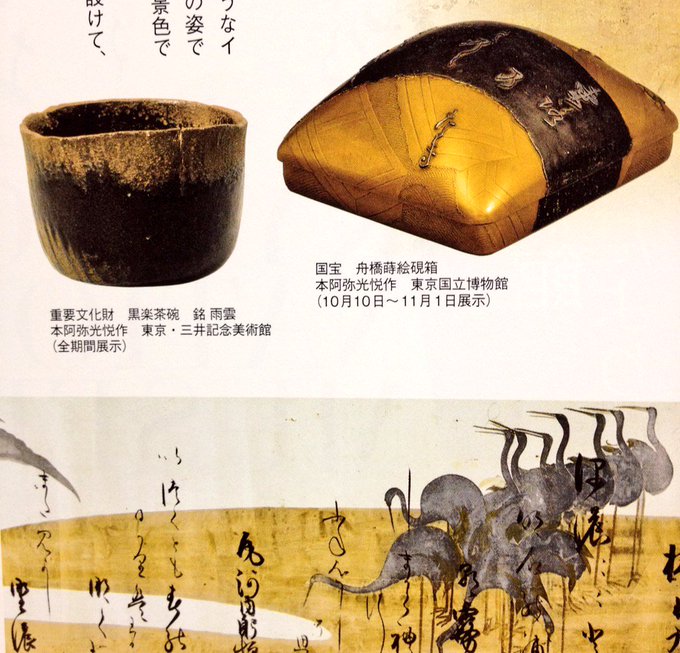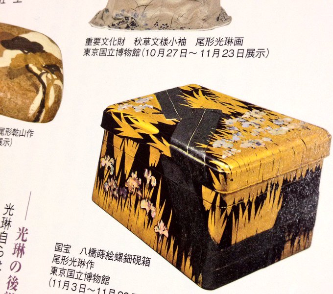 琳派 京を彩る(京博) 風神雷神図屏風の他にも、斬新なフォルムが格好良い舟橋蒔絵硯箱や13.56mにおよぶ鶴下絵三十六歌仙和歌巻、八橋蒔絵螺鈿硯箱など数え上げたらきりがないほど素晴らしい作品が沢山(^-^) #bura_bi_now
