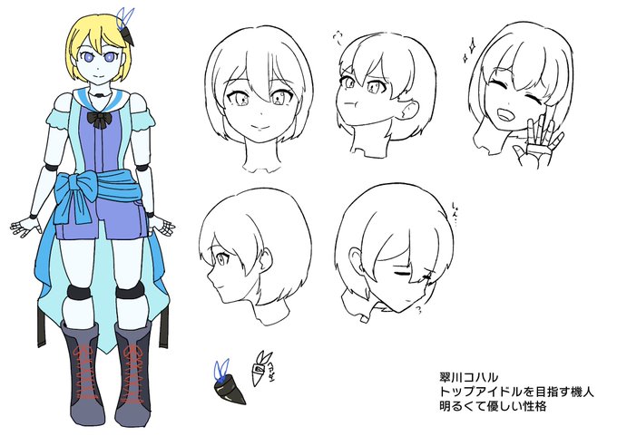 #うえだ一次創作 創作アイドル談 翠山コハル。機人でありながら孤児で人間の義両親に育てられた子。両親の助けになりたく、自分にできる「人を笑顔にできること」としてアイドルの道を目指し始めた。優しい普通の女の子。ちょっと珍しい肌が水色タイプ(普通は灰色が多い)。