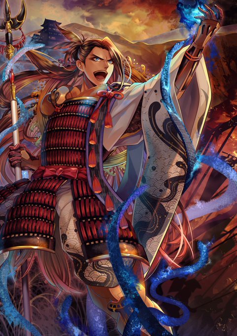 【斎藤道三】 加納口の戦いをイメージして描きました。 調べていくうちにどんどん好きになった武将です。 衣装に波・僧侶・槍術・鷹(頼芸)の要素を入れております。手にしてる炎は美濃のような形にしてみました。 #戦国TCGイラコン