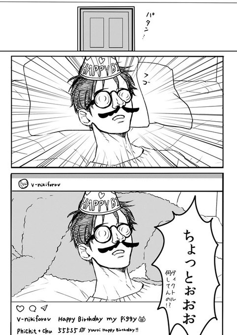 二日遅れの勇利誕生日祝い漫画(後編)です。我が宅のヴィクさんはいつも格好がつかない。再UPです眼鏡忘れてたコマがあったんです…勇利おめでとう!
