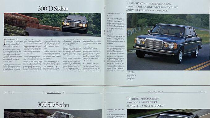 北米で空前のディーゼルブームだった80年代に販売されたW123系はガソリン車の設定がなく、直列5気筒ディーゼルターボの300D/300TD/300CDを販売。