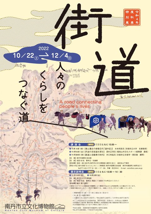 南丹市域には山陰街道、篠山街道、若狭街道など複数の街道がありました。本展では街道の諸相を伝える資料を展示し歴史や周辺地域の文化について紹介します